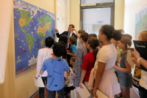 Olrik Laufer zeigt den Wettbewerbsteilnehmern und Teilnehmerinnen wo sich unsere Partnerstadt befindet.