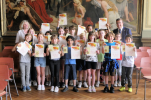 Die Freude bei den Domschülerinnen und –schülern war zur „Siegerehrung“ kurz vor dem Beginn der Sommerferien groß. Zusammen mit dem Vorsitzenden des Trägervereins Partnerschaft Minden-Changzhou e. V., Olrik Laufer, Katharina Kohlmeyer (bei der Stadt Minden für Städtepartnerschaften und Patenschaften zuständig) und Schulleiterin Marita Stein-Willemsen wurden an alle 21 ausgezeichneten Schüler*innen Urkunden und chinesische Lesezeichen übergeben.